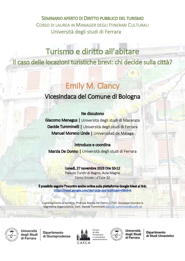 E' possibile seguire l’incontro anche online sulla piattaforma Google Meet al link: https://meet.google.com/daz-uuja-zpa?authuser=0&hl=it Coordinamento scientifico: Prof.ssa Marzia De Donno | Prof. Giuseppe Scandurra Segreteria organizzativa: Dott. Davide Tumminelli (davide.tumminelli@unife.it) Locandina evento: