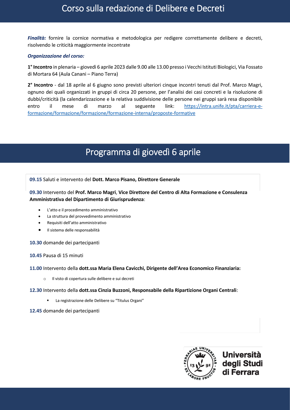 Corso sulla redazione di Delibere e Decreti (riservato al personale Unife) a cura del Prof. Marco Magri, Vice Direttore del C.A.F.C.A